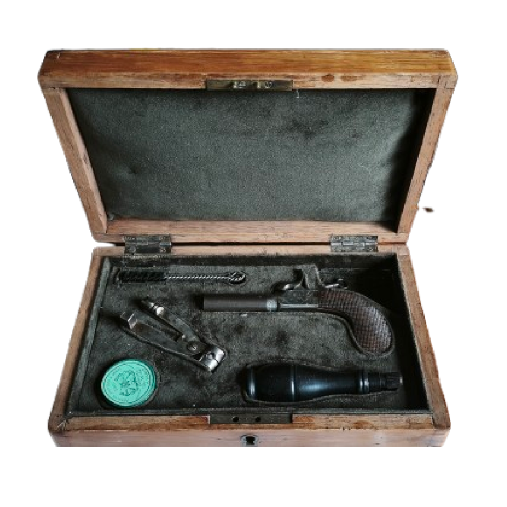 Beau coffret fermant à clé, contenant un très joli pistolet coup de poing, à balle forcée, en calibre 12mm, réalisé par le célèbre Auguste FRANCOTTE à Liège.